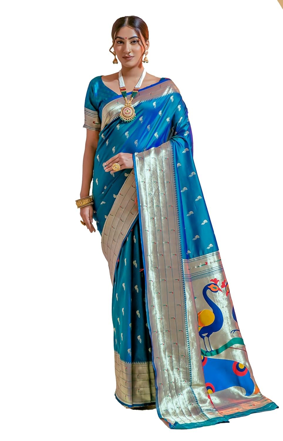 Pujia Mills woman pure banarasi silk paithani saree Indian ethnic wear kanjivaram saree with heavy golden zari woven border with unique peacock designe rich pallu soft saree wedding saree 2025