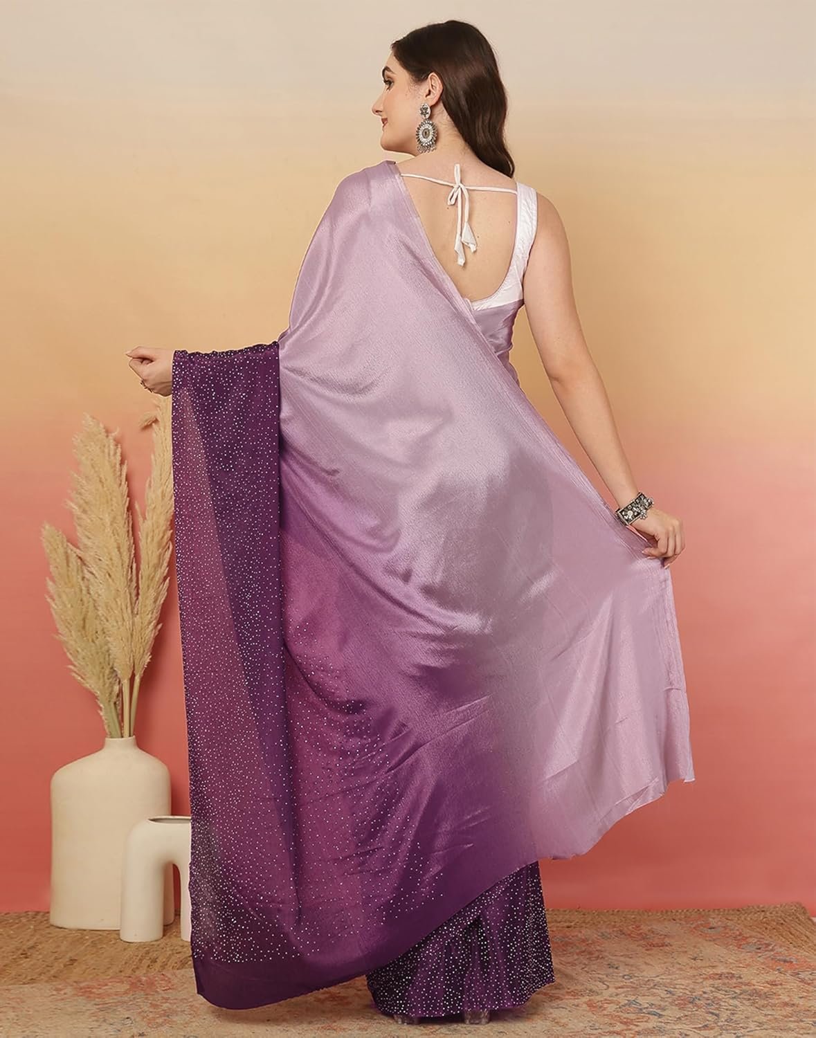 Review: Quite a few stones coming out here and there. Also note that the stones appear like big crystals in the picture but are in fact very tiny cheap stones, if u can even call them stones. And it looks like the stones are arranged in a pattern and denser near the ends, it is not. Rather uniformly distributed.Threads at the borders coming out so borders need fixing. The material feels silky smooth. The fabric is satin, pretty good quality. The colour is gorgeous purple. I was thinking of returning it because of how the stones and threads are coming out but my friends said that i look good in it. So i kept it. But yeah it does give burkha vibes.The blouse piece has no decoration at all, it is just a plain violet piece of fabric.