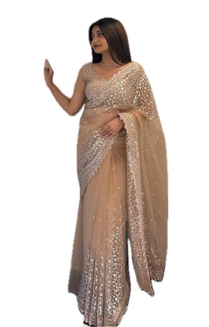 Vinayak Textile Women’s Brown Net Sequence Worked Saree With Unstitched Blouse (Soneri A3)